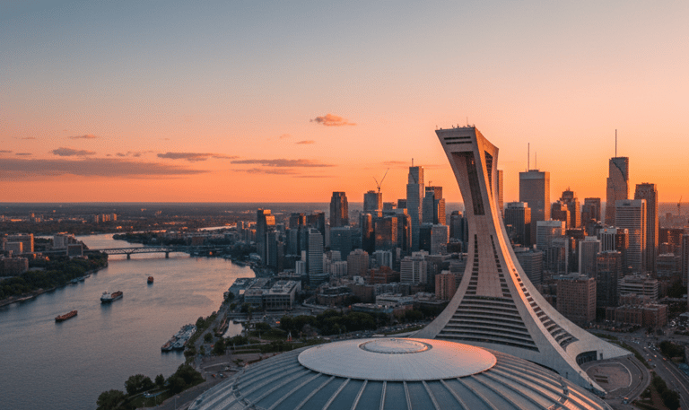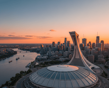 This picture highlights Montréal's distinctive urban landscape, featuring the striking architecture of the Olympic Stadium, a lasting legacy of the 1976 Summer Games. Its leaning tower is a prominent landmark, standing tall against the city skyline. This image captures the modern, dynamic side of Quebec, showcasing its architectural innovation and status as a major North American metropolis.