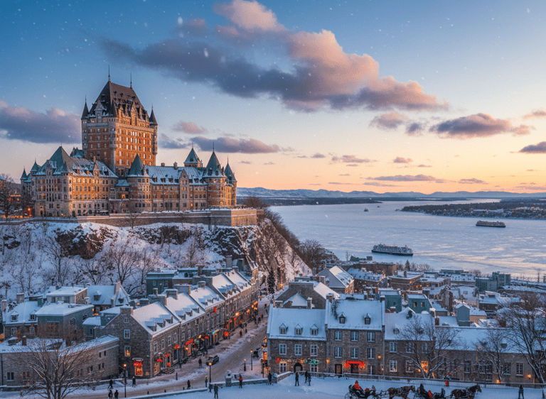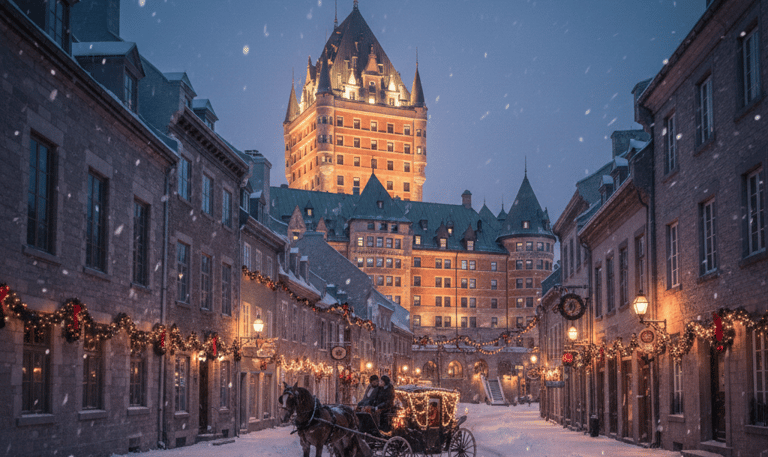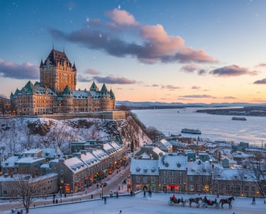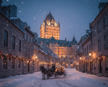 This image shows the iconic, snow-covered streets of Old Quebec City, with the Château Frontenac visible in the background. The charming architecture, adorned with festive lights and a fresh blanket of snow, evokes a sense of timeless European romance. The narrow streets hint at centuries of history, while the horse-drawn carriage adds to the picturesque, storybook atmosphere.